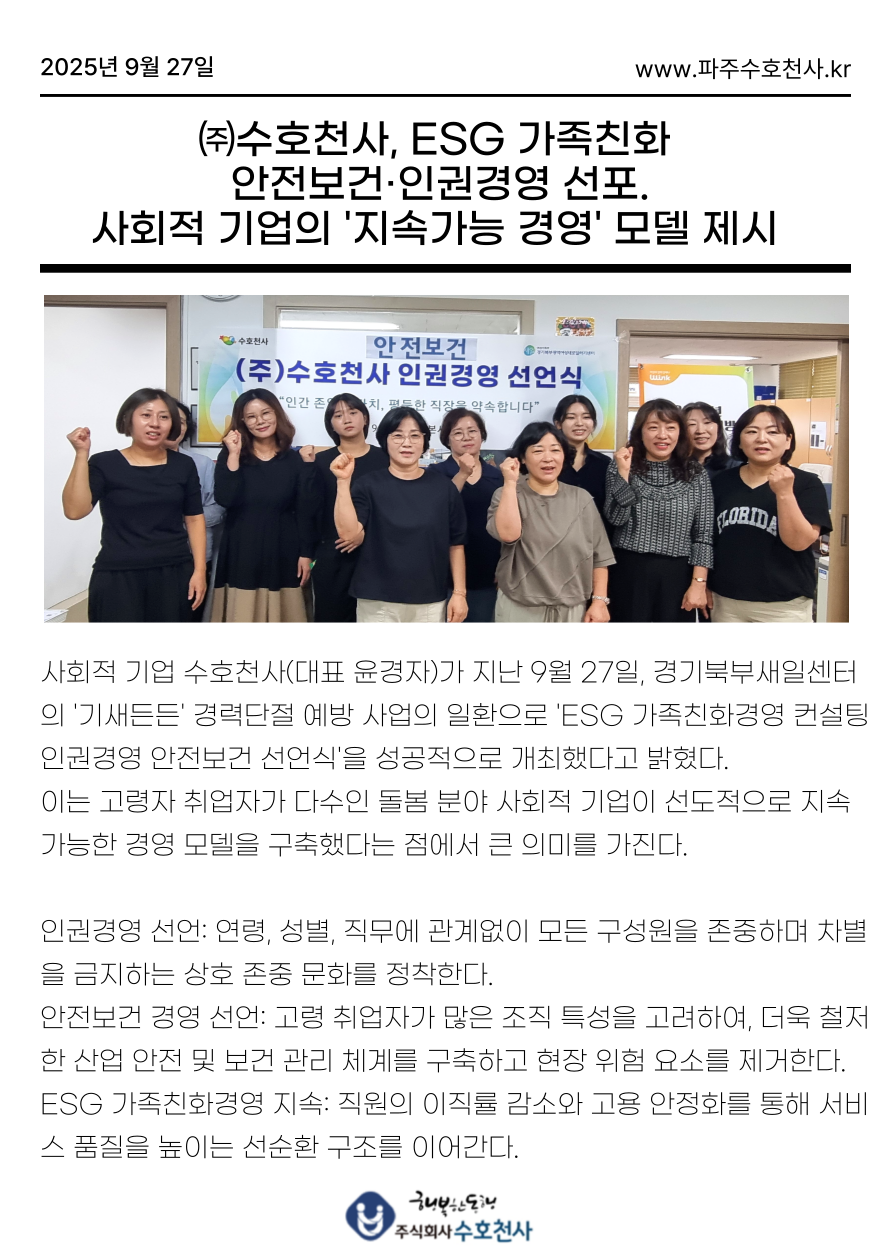 ㈜수호천사, ESG 가족친화경영 선포... 고령 친화 사회적 기업의 '지속가능 경영' 모델 제시